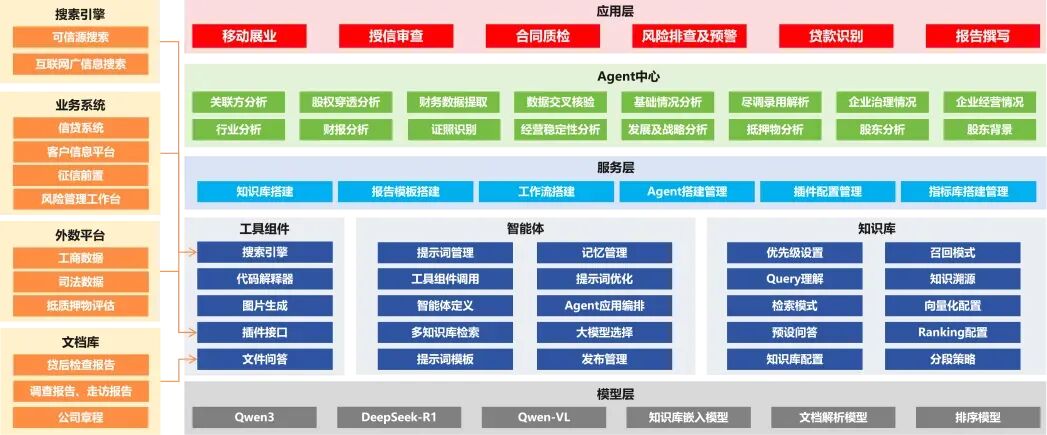 模型层主要包含本项目中使用到的各类AI模型,分别有生成式文本大模型Qwen3系列、DeepSeek-R1系列,多模态大模型Qwen-VL,用于构建知识库的词嵌入模型,各类文档解析MinerU等模型,以及RAG过程中涉及到的重排序算法模型等,模型层实现多模型间的动态协同、负载均衡与结果融合,确保在风险排查、报告生成、异常识别等场景中“看得准、写得对、判得准、跑得快”,作为稳定、高效、可解释的AI基础能力支撑,是智能化风控体系从“辅助工具”迈向“自主决策”的关键技术基石。